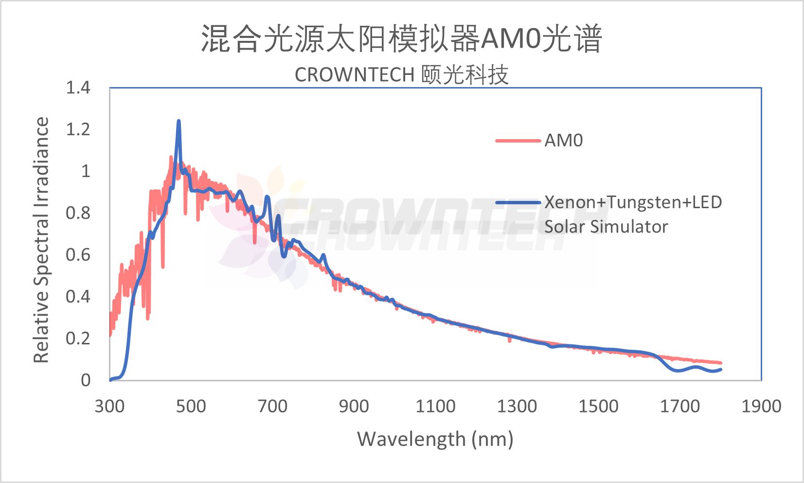 混合光源太阳模拟器由氙灯、卤钨灯和多种波长LED组成。其中氙灯与卤钨灯构成了300-1800nm的主要光谱成份,模拟的AM0光谱可以达到12.5%的A+类级别。而多种波长LED模块中的每个LED的光强都可独立调节,从而保证被测电池的短路电流,尤其是多结电池每一结的短路电流都可精准地匹配预期值。 混合光源太阳模拟器的均匀性可以达到2%的A类水平,时间稳定性可以达到0.5%的A类水平。